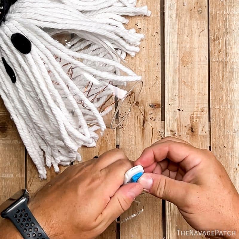 Okay, now that Google is happy and off my back, let’s get back to our mop ghosts. Flip the mop head over and put a bunch of hot glue all over the piece of plastic that lives under there. You could use super glue or E-6000 or any other strong adhesive for this step if you don’t happen to have a hot glue gun.