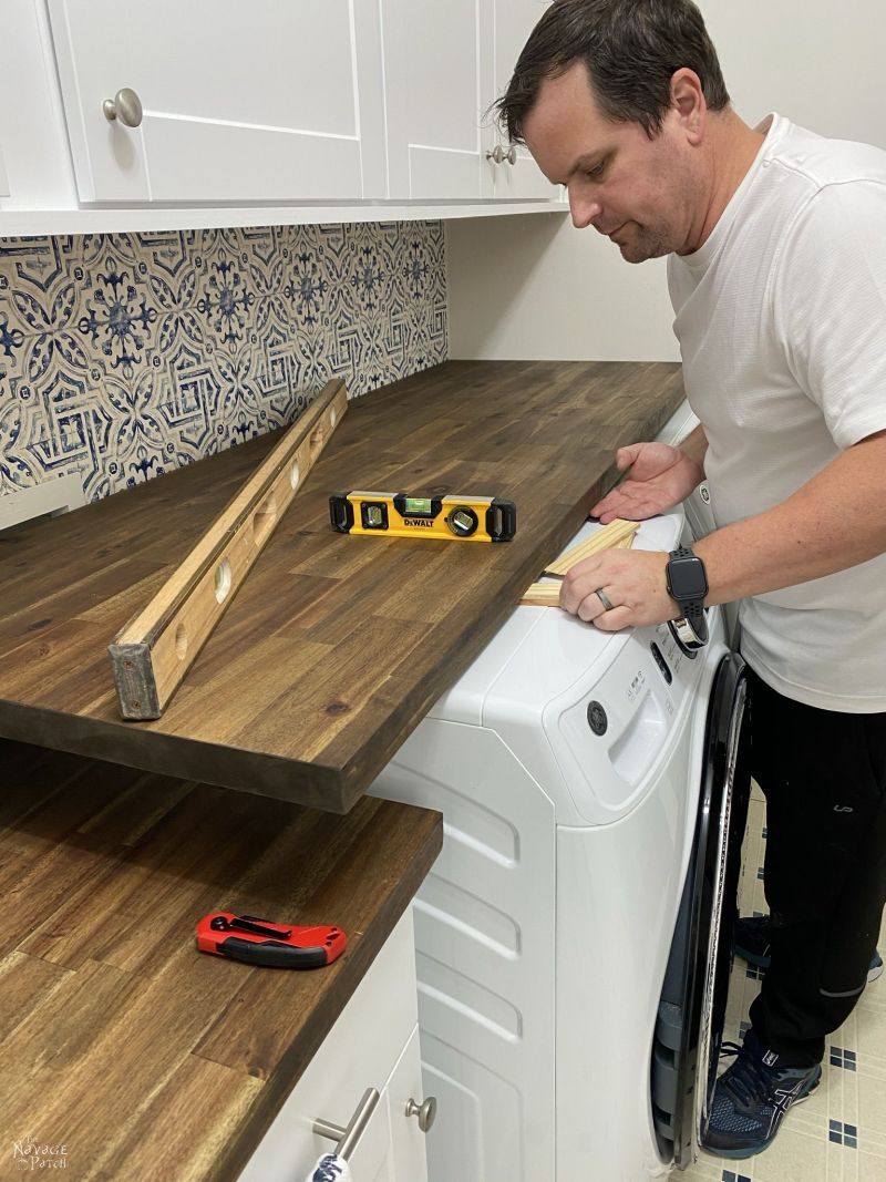 Eventually and at long last, the final acacia countertop arrived at Home Depot. My babes and I retrieved it and set to work on the final component of the laundry room remodel build: the washer/dryer countertop.
